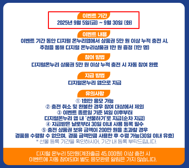 이벤트 기간 동안 디지털온누리 앱에서 상품권을 5만 원 이상 누적 충전하면 자동으로 응모됩니다.