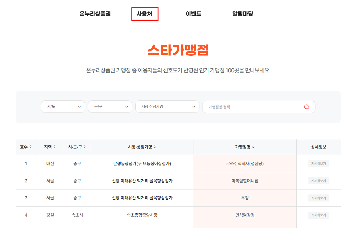 더 자세한 사용처는 온누리상품권 공식 홈페이지에 접속하여 사용처를 클릭해서 검색해 보시기 바랍니다.