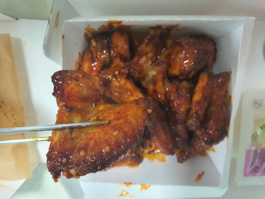 맛은 맵기도 적당하고 달콤해서 한마리를 다 먹을 수 있을 것 같다(윙 세트). 하지만 밥이랑 먹기 더 좋은 치킨이기 때문에 반은 다음날을 위해 남겨두고 밥이랑 먹는것을 추천.