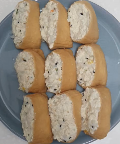 3. 유부의 물기를 적당히 짠 다음 비벼준 두부를 유부속에 조심히 채워 넣는다.