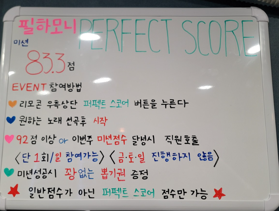 필하모니 노래방에는 아래와 같은 퍼펙트 스코어 미션 벤트가 있다. 그냥 부르는 것보다 목표가 있으면 더 재밌으니 이벤트를 진행해서 뽑기권을 얻었다.