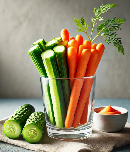 오이와 당근 같은 채소 스틱은 수분 함량이 높고 칼로리가 낮아 다이어트 간식으로 제격입니다.